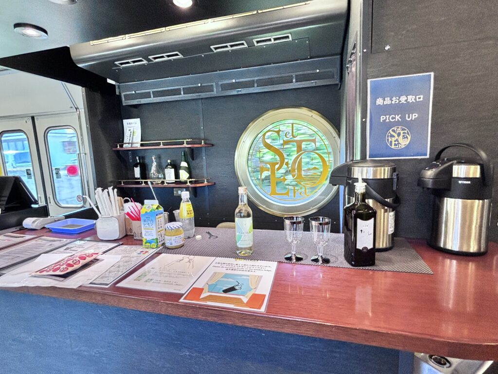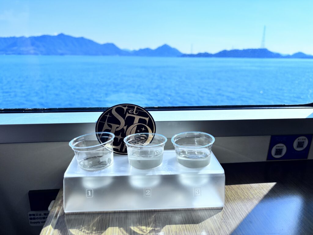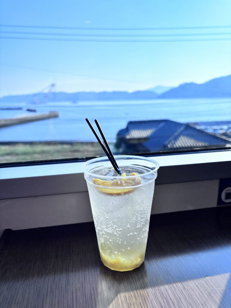瀬戸内海の景色と重なり、この列車らしさを感じる一杯です。