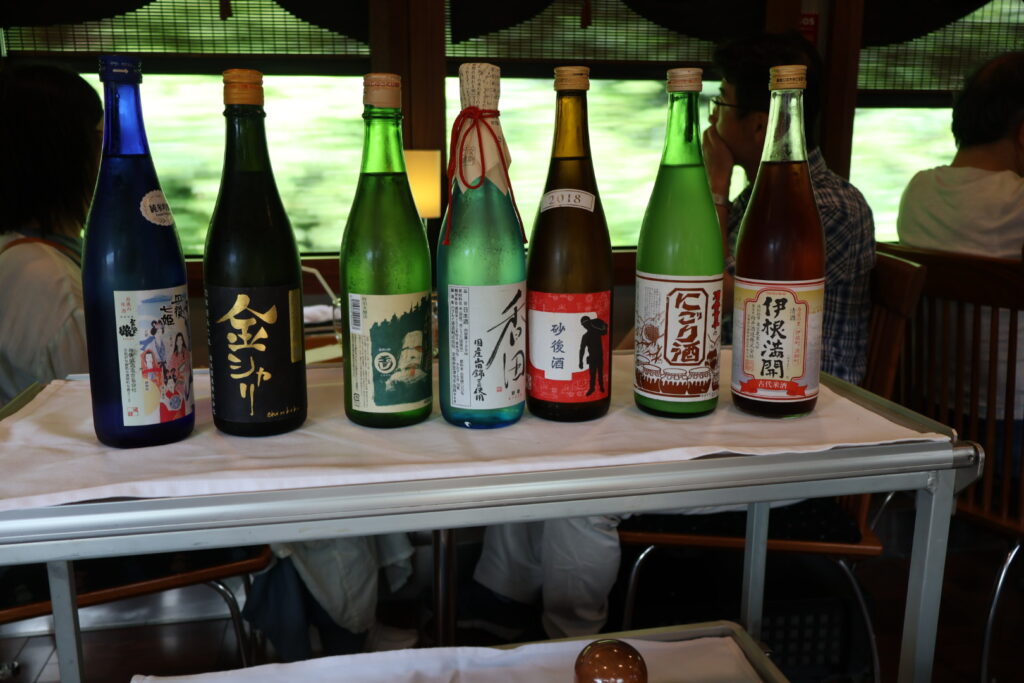ランチコースでは、車内で日本酒を飲み比べる楽しみもあります。