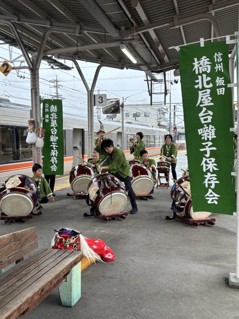飯田駅では、出発前に 獅子舞と太鼓によるおもてなし が行われていました。
