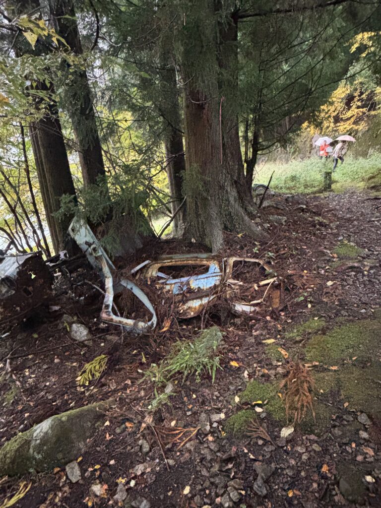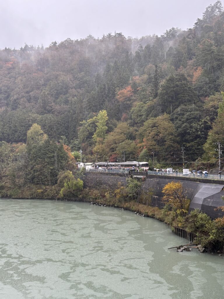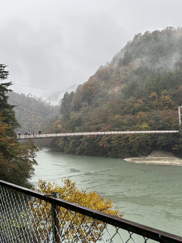 紅葉は見頃でしたが、霧と雨に包まれた山あいの景色が、より秘境らしさを強めていました。