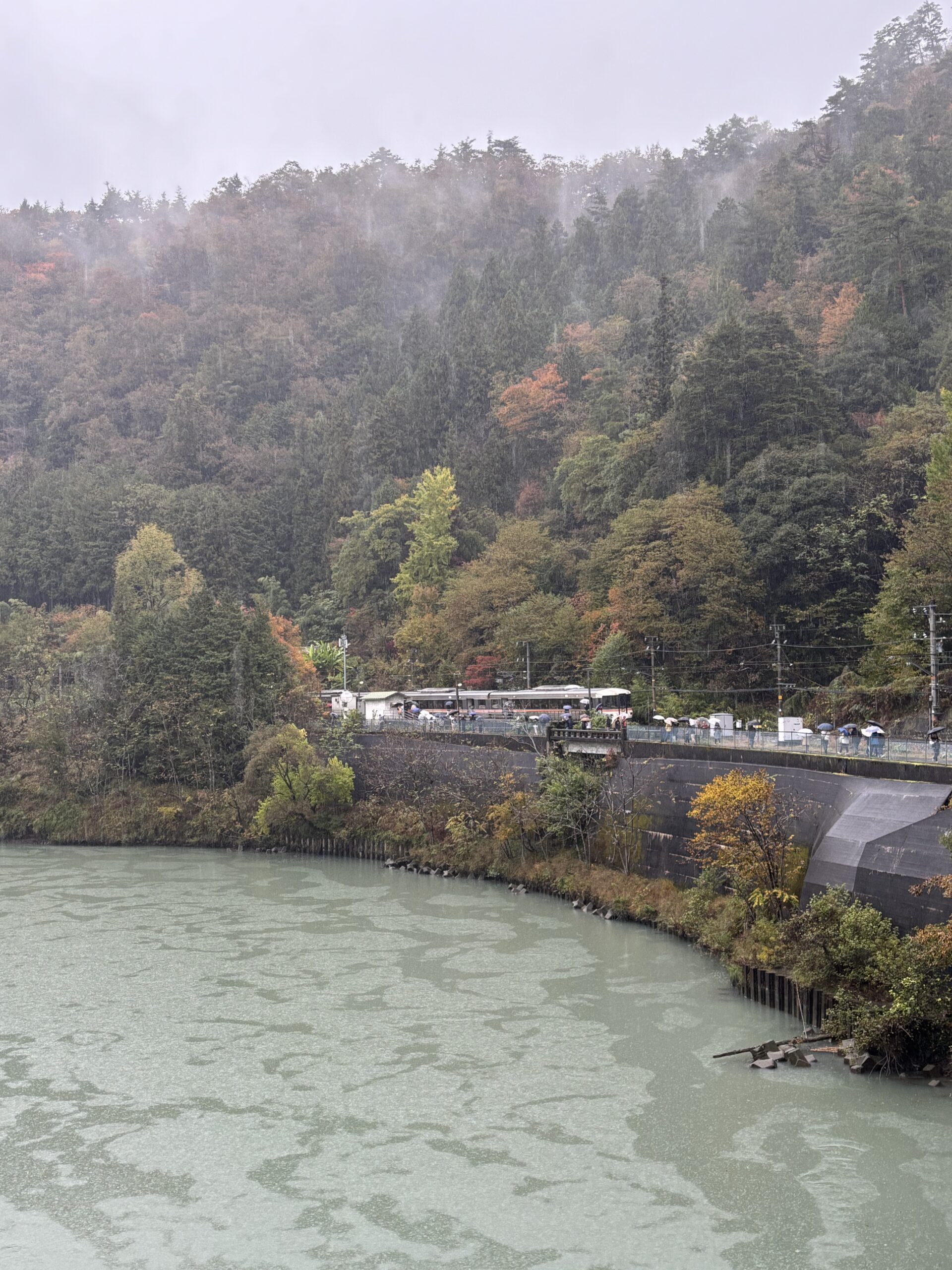 紅葉は見頃でしたが、霧と雨に包まれた山あいの景色が、より秘境らしさを強めていました。